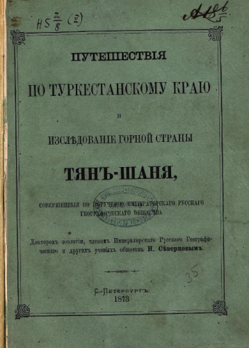 Северцов, Николай Алексеевич. Путешествия по Туркестанскому краю и исследование горной страны Тян-Шаня [Электронный ресурс] . Ч. 1. Общие отчеты о путешествиях 1857-1868 годов / совершенные по поручению Имп. Рус. геогр. о-ва д-ром зоологии, чл. Рус. геогр. и др. ученых обществ Н. Северцовым. - Санкт-Петербург, 1873 (2013). - [4], VI, 462 с., 1 л. карт.