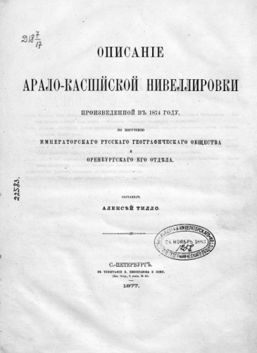 Тилло, Алексей Андреевич (1839-1899). Описание Арало-Каспийской нивеллировки, произведенной в 1874 году по поручению Русского географического общества и Оренбургского его отдела [Электронный ресурс] / сост. Алексей Тилло. - Санкт-Петербург, 1877 (2015). - 42 с., 4 л. ил.