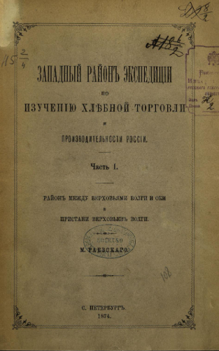 Труды экспедиции, снаряженной Императорскими Вольным экономическим и Русским географическим обществами, для исследования хлебной торговли и производительности в России. Т. IV, Вып. 1 : Западный район. Ч. 1 : Район между верховьями Волги и Оки и пристани верховьев Волги / [исс.] М. Раевского - С.-Петербург, 1874