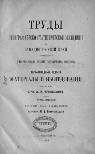 Труды Этнографическо-статистической экспедиции в Западно-русский край, снаряженной Императорским Русским географическим обществом. Юго-западный отдел : Материалы и исслед., собр. д. чл. П.П. Чубинским. Т. 6 : Народные юридические обычаи по решениям волостных судов / изд. под набл. чл.-сотр. П.А. Гильтебрандта. - С.-Петербург, 1872