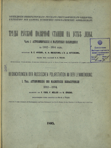 Труды Русской полярной станции на устье Лены. Ч. 1 : Астрономические и магнитные наблюдения за 1882-1884 год / обр. В.Е. Фусом, Ф.Ф. Миллером и Н.Д. Юргенсом, изд. под ред. А.А. Тилло. - Санкт-Петербург, 1895