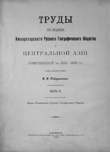 Труды экспедиции ИРГО по Центральной Азии, совершенной в 1893-1895 гг. под нач. В.И. Роборовского. Ч. 3 : Научные результаты экспедиции. - Санкт-Петербург, 1899