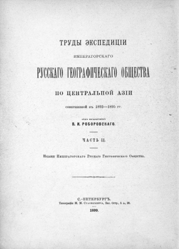 Труды экспедиции ИРГО по Центральной Азии, совершенной в 1893-1895 гг. под нач. В.И. Роборовского. Ч. 2 : Отчет помощника начальника экспедиции П.К. Козлова. - Санкт-Петербург, 1899