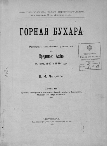 Липский, Владимир Ипполитович (1863-1937). Горная Бухара : результаты трехлетних путешествий в Среднюю Азию в 1896, 1897 и 1899 году. Ч. 3 : Хребет Гиссарский и Восточная Бухара : хребет Дарвазский, Мазарский и Петра Великого. - С.-Петербург, 1905