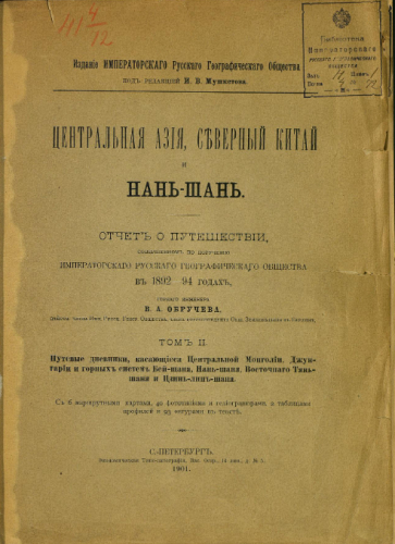 Обручев, Владимир Афанасьевич (1863-1956). Центральная Азия, Северный Китай и Нань-Шань : отчет о путешествии, совершенном по поручению ИРГО в 1892-1894 гг. Т. 2 : Путевые дневники, касающиеся Центральной Монголии, Джунгарии и горных систем Бей-шаня, Нань-шаня, Восточного Тянь-шаня и Цзынь-линь-шаня. - С.-Петербург, 1901