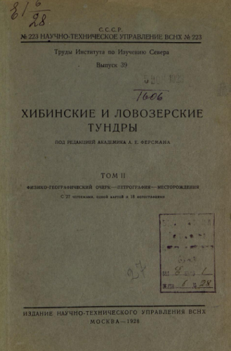 Труды Института по изучению Севера. Вып. 39 : Хибинские и Ловозерские тундры. Т. 2 : Физико-географический очерк - Петрография - Месторождения / под ред. акад. А.Е. Ферсмана. - Москва : Науч.-тех. управление ВСНХ, 1928