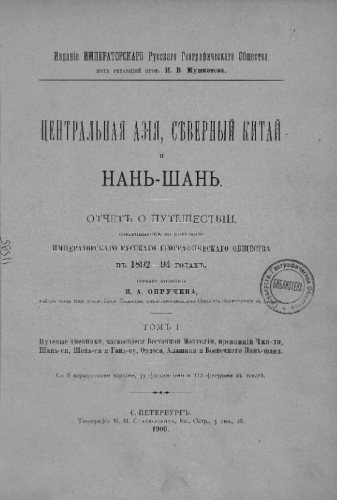 Центральная Азия, Северный Китай и Нань-Шань : отчет о путешествии, совершенном по поручению ИРГО в 1892-1894 гг. Т. 1 : Путевые дневники, касающиеся Восточной Монголии, провинции Чжи-ли, Шань-си, Шень-си и Гань-су, Ордоса, Алашаня и Восточного Нань-Шаня