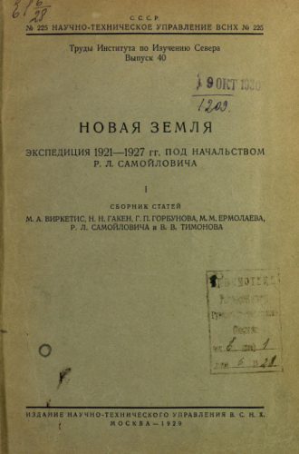 Труды Института по изучению Севера. Вып. 40 : Новая Земля : экспедиция 1921-1927 гг. под начальством Р.Л. Самойловича. [Ч.] 1. - Москва : Науч.-тех. управление ВСНХ, 1929