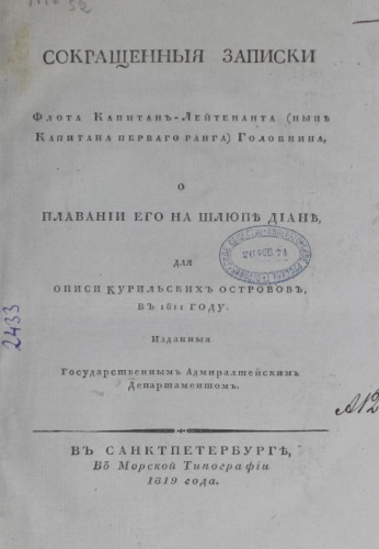 Головнин, Василий Михайлович (1776-1831). Сокращенные записки флота капитан-лейтенанта (ныне капитана первого ранга) Головнина о плавании его на шлюпе Диане для описи Курильских островов в 1811 году / изд. Гос. Адмиралтейским департаментом. - Санкт-Петербург : Мор. тип., 1819