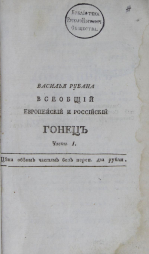 Рубан, Василий Григорьевич (1742-1795). Всеобщий и совершенный гонец и путеуказатель, или Полный повсеместный российский и повсюдный европейский дорожник : исправно и верно показующий по нынешнему разделению на губернии и области всей Российской империи и прочих европейских держав почтовые пути... / Собр. и изд. к. с. В. Рубаном ; иждивением В.С[опикова]. - Санкт-Петербург, 1791