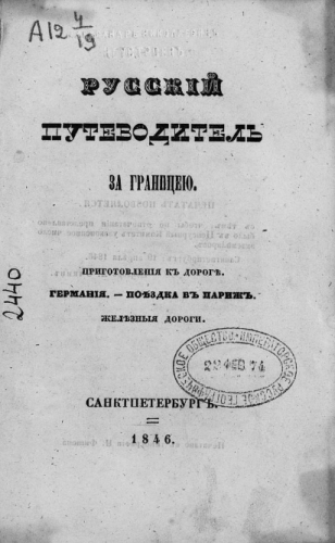 Греч, Алексей Николаевич (1814-1850). Русский путеводитель за границею : Приготовление к дороге. Германия - Поездка в Париж. Железные дороги. - Санкт-Петербург : Тип. И. Фишона, 1846
