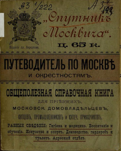 Спутник москвича : путеводитель по Москве и окрестностям. Общеполез. справ. кн. для приезжих, моск. домовладельцев, купцов, промышленников и купеч. приказчиков / изд. Ал. Барсукова. - [Москва] : Тип. "Рассвет", ценз. 1890