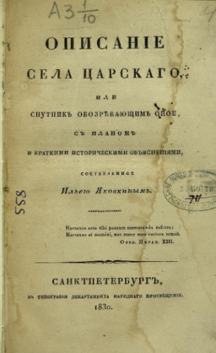Яковкин, Илья Федорович (1764-1836). Описание Села Царского, или Спутник обозревающим оное с планом и краткими историческими объяснениями / сост. Ильею Яковкиным. - Санкт-Петербург : Тип. Департамента народного просвещения, 1830