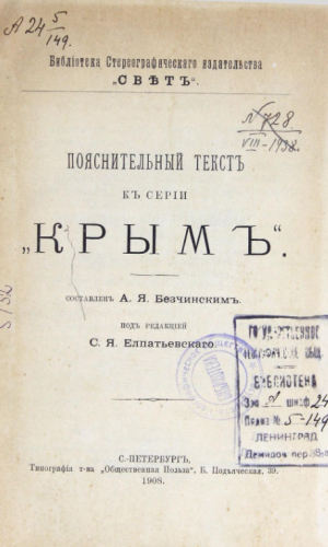 Безчинский, Александр Яковлевич. Пояснительный текст к серии "Крым" / сост. А. Я. Безчинским ; Библиотека стереографического издательства "Свет". - Санкт-Петербург : Тип. т-ва "Обществ. польза", 1908
