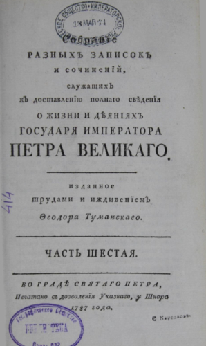 Туманский, Федор Осипович (1746-1810). Собрание разных записок и сочинений, служащих к доставлению полного сведения о жизни и деяниях государя императора Петра Великого. Ч. 6. / Изд. трудами и иждивением Феодора Туманского. - Санкт-Петербург : Печ. у Шнора, 1787