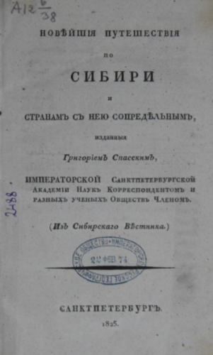 Спасский, Григорий Иванович (1783-1864). Новейшие ученые и живописные путешествия по Сибири : (Из "Сибирского вестника") / изд. Григорием Спасским, Имп. Санкт-Петербургской Акад. наук корр. и разных ученых о-в чл. - Санкт-Петербург, 1825