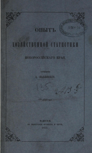 Скальковский, Аполлон Александрович (1808-1898). Опыт хозяйственной статистики Новороссийского края / соч. А. Скальковского. - Одесса : Тип. Францова и Нитче, 1853