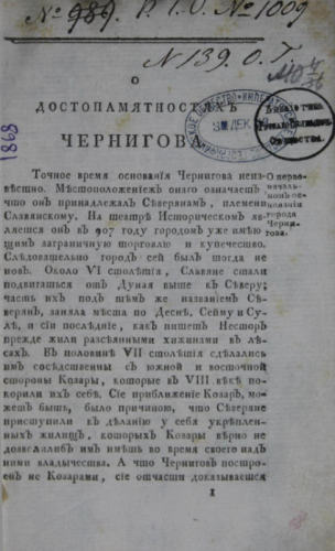 Марков, Михаил Егорович (? - 1823/24). О достопамятностях Чернигова / [соч. директора училищ Черниговской губернии статского советника Михаила Маркова]. - [Санкт-Петербург, 1816]