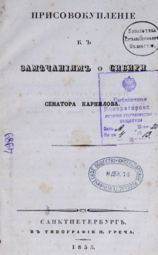 Корнилов, Алексей Михайлович (1760-1843). Присовокупление к Замечаниям о Сибири : Взгляд на Китай / [соч.] сенатора Карнилова. - Санкт-Петербург : В тип. Н. Греча, 1835