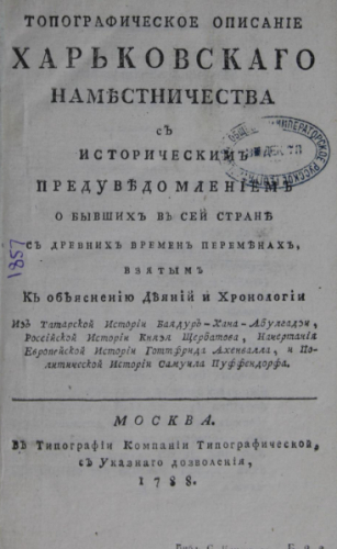 Переверзев, Иван Афанасьевич (?-1794). Топографическое описание Харьковского наместничества : c историческим предуведомлением о бывших в сей стране с древних времен переменах, взятым к объяснению деяний и хронологии из Татарской истории Баядур-хана-Абулгадзи, Российской истории князя Щербатова, начертания европейской истории Готтфрида Ахенвалла и политической истории Самуила Пуффендорфа. - Москва : В тип. Компании типографической, 1788