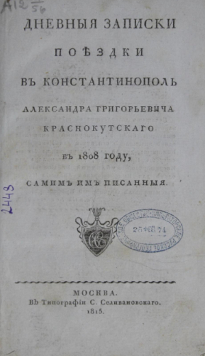 Краснокутский, Александр Григорьевич (1781-1841). Дневные записки поездки в Константинополь Александра Григорьевича Краснокутского в 1808 году / самим им писанные. - Москва : В тип. С. Селивановского, 1815