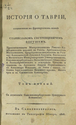 Сестренцевич-Богуш, Станислав (1731-1826). История о Таврии. Т. 1. / Соч. на фр. яз. Станиславом Богушем, преосвященным митрополитом римско-католических церквей в России... - Санкт-Петербург : В тип. Шнора, 1806