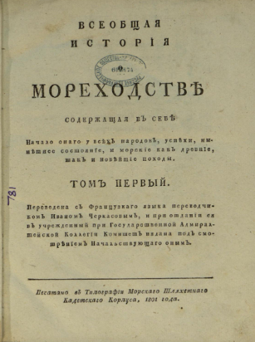 Торше де Буамеле, Жан Батист. Всеобщая история о мореходстве, содержащая в себе начало оного у всех народов, успехи, нынешнее состояние и морские как древние, так и новейшие походы. Т. 1 : [Кн. 1-7] / пер. с фр. яз. Иваном Черкасовым. - Санкт-Петербург : В тип. Мор. шляхт. кадет. корпуса, 1801