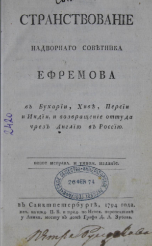 Ефремов, Филипп Сергеевич (1750-после 1811). Странствование надворного советника Ефремова в Бухарии, Хиве, Персии и Индии, и возвращение оттуда через Англию в Россию. - Санкт-Петербург : Печ. на ижд. П. Б[огдановича] и прод. по Невск. перспективе у Аничк. моста в доме графа Д.А. Зубова, 1794
