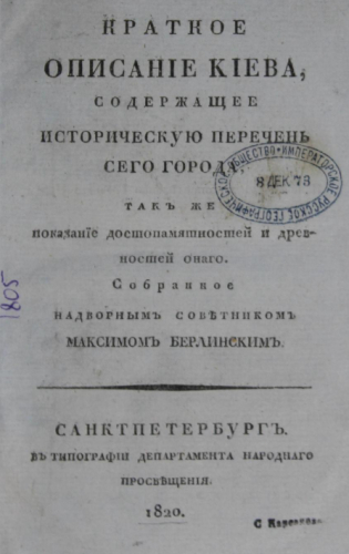 Берлинский, Максим Федорович (1764-1848). Краткое описание Киева : Содержащее историческую перечень сего города, также показание достопамятностей и древностей оного / Собр. надворным советником Максимом Берлинским. - Санкт-Петербург : Тип. Департ. народного просвещения, 1820
