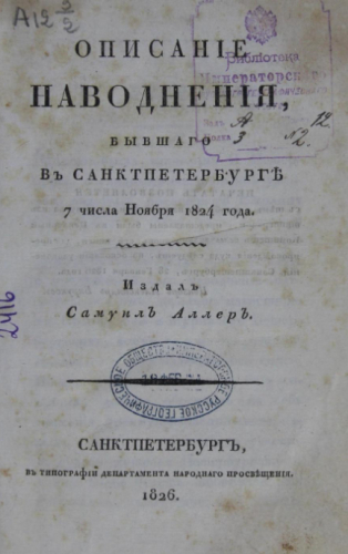 Аллер, Самуил Иванович (1789-1860). Описание наводнения, бывшего в Санкт-Петербурге 7 числа ноября 1824 года / изд. Самуил Аллер. - Санкт-Петербург : Тип. Департ. народного просвещения, 1826