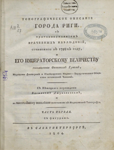 Гун, Отто. Топографическое описание города Риги с присовокуплением врачебных наблюдений. Ч. 1. / соч. в 1798-м году, и е.и.в посвященное Оттоном Гуном, медицины доктором, Гос. Мед. коллегии и О-ва швейцарских врачей почетным чл. ; с нем. пер. Василием Джунковским. - Санкт-Петербург, 1804