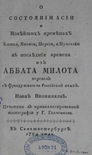 Милло, Клод Франсуа Ксавье (1726-1785). О состоянии Азии и новейших переменах Китая, Японии, Персии, и Монголии в последние времена / из аббата Милота пер. с фр. на российской язык Иван Иконников. - Санкт-Петербург : В тип. Г. Галченкова, 1784