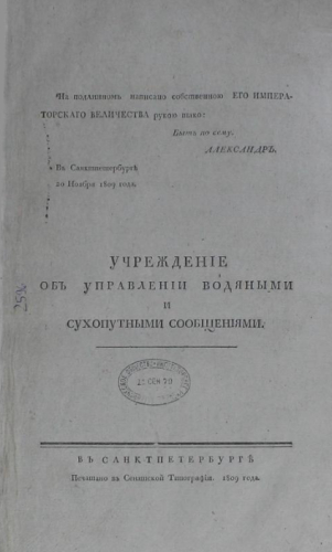 Учреждение об управлении водяными и сухопутными сообщениями : [утв. 20 ноября 1809 г.]. - Санкт-Петербург : В Сенатской тип., 1809
