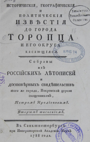 Иродионов, Петр. Исторические, географические и политические известия до города Торопца и его округа касающиеся / cобр. из российских летописей и достоверных свидетельств того же города, Покровской церкви священником, Петром Иродионовым. - вторым тиснением - Санкт-Петербург : При Имп. Акад. наук, 1788