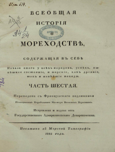 Торше де Буамеле, Жан Батист. Всеобщая история о мореходстве, содержащая в себе начало оного у всех народов, успехи, нынешнее состояние и морские как древние, так и новейшие походы. Ч. 6 : [Кн. 28-29] / пер. с фр. подл. Васильем Берковым. - Санкт-Петербург : В Мор. тип. , 1825