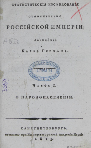 Герман, Карл Федорович (1767-1838). Статистические исследования относительно Российской империи. Ч. 1 : О народонаселении. - Санкт-Петербург : При Имп. Акад. наук, 1819