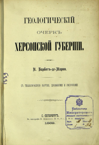 Барбот-де-Марни, Николай Павлович (1829?-1877). Геологический очерк Херсонской губернии / Н. Барбот-де-Марни. - Санкт-Петербург : Тип. В. Демакова, 1869