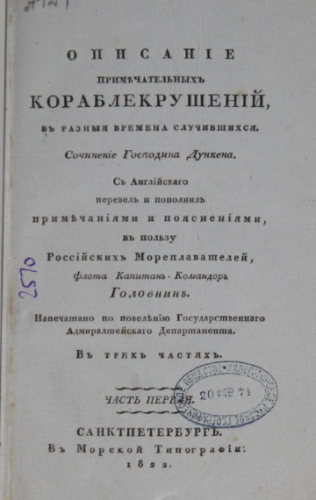 Дункан, Арчибальд. Описание примечательных кораблекрушений, в разные времена случившихся. Ч. 1. / Соч. г-на Дункена ; с англ. пер. и пополнил прим. и пояснениями, в пользу российских мореплавателей, флота капитан-командор Головнин. - Санкт-Петербург : Мор. тип., 1822