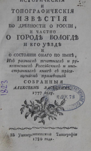 Засецкий, Алексей Александрович (1717-1784). Исторические и топографические известия по древности о России, и частно о городе Вологде и его уезде и о состоянии онаго поныне / собр. Алексеем Засецким в 1777 году. - Москва : Унив. тип., 1780