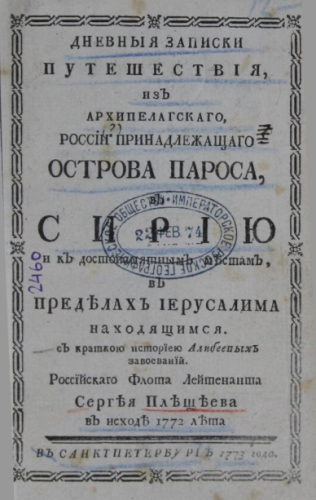 Плещеев, Сергей Иванович (1752-1802). ДДневные записки путешествия из архипелагского России принадлежащего острова Пароса в Сирию и к достопамятным местам, в пределах Иерусалима находящимся : с краткой историей Алибеевых завоеваний / [соч.] лейт. Сергея Плещеева в исходе 1772 лета. - Санкт-Петербург, 1773