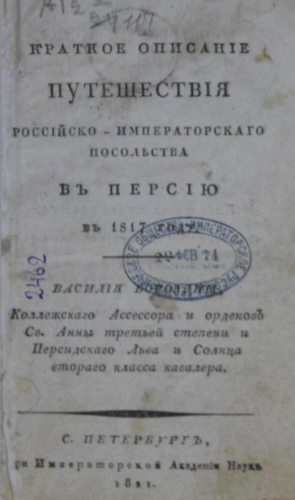 Бороздна, Василий Петрович. Краткое описание путешествия российско-императорского посольства в Персию в 1817 году / [соч.] Василия Бороздны, коллежского асессора и орденов св. Анны третьей степени и персидского Льва и Солнца второго класса кавалера. - Санкт-Петербург : При Имп. Акад. наук, 1821
