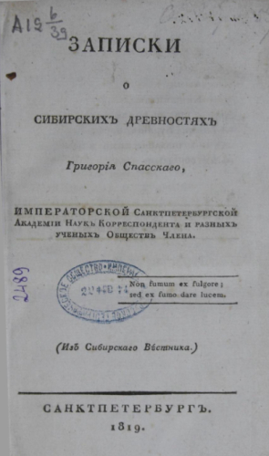 Спасский, Григорий Иванович (1783-1864). Записки о сибирских древностях : (Из "Сибирского вестника") / Григория Спасского, Имп. Санкт-Петербургской Акад. наук корр. и разных ученых Обществ чл. - Санкт-Петербург, 1819