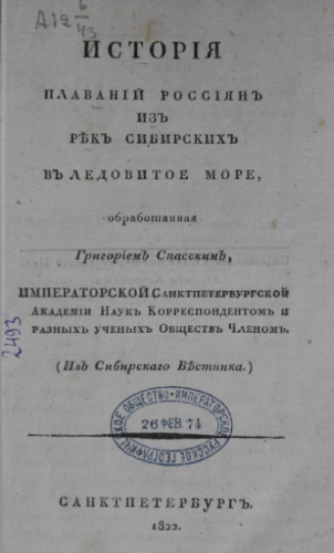 Спасский, Григорий Иванович (1783-1864). История плаваний россиян из рек сибирских в Ледовитое море : (Из "Сибирского вестника") / обраб. Григорием Спасским, Имп. Санкт-Петербургской Акад. наук корр. и разных ученых о-в чл. - Санкт-Петербург, 1822
