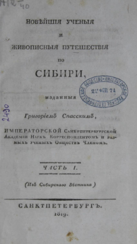 Спасский, Григорий Иванович (1783-1864). Новейшие ученые и живописные путешествия по Сибири : (Из "Сибирского вестника") / изд. Григорием Спасским, Имп. Санкт-Петербургской Акад. наук корр. и разных ученых о-в чл. - Санкт-Петербург, 1819