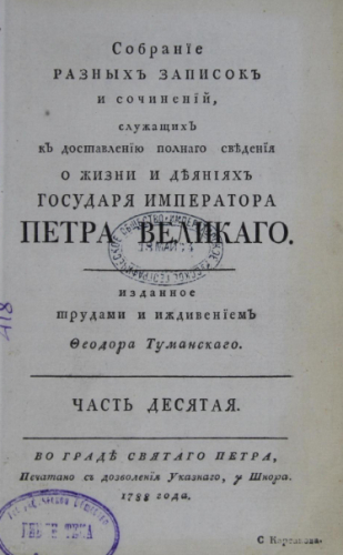 Туманский, Федор Осипович (1746-1810). Собрание разных записок и сочинений, служащих к доставлению полного сведения о жизни и деяниях государя императора Петра Великого. Ч. 10. / Изд. трудами и иждивением Феодора Туманского. - Санкт-Петербург : Печ. у Шнора, 1788