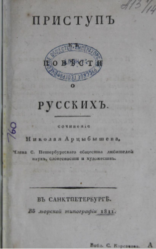 Арцыбашев, Николай Сергеевич (1773-1841). Приступ к повести о русских / соч. Николая Арцыбышева, члена С. Петербургского общества любителей наук, словесности и художеств. - Санкт-Петербург : Мор. тип., 1811