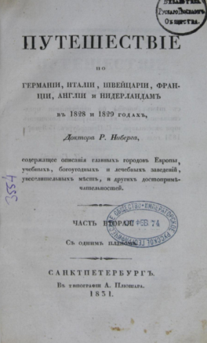 Ниберг, Рейнгольд (1795-1836). Путешествие по Германии, Италии, Швейцарии, Франции, Англии и Нидерландам в 1828 и 1829 годах доктора Р. Ниберга... Ч. 2. - Санкт-Петербург : В тип. А. Плюшара, 1831