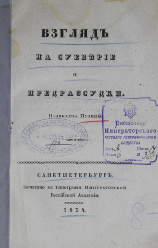 Пузино, Поликарп Иванович (1781-1866). Взгляд на суеверие и предрассудки / [Соч.] Поликарпа Пузины. - Санкт-Петербург : Тип. Имп. Российской акад., 1834