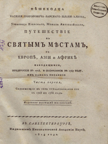 Григорович-Барский, Василий Григорьевич (1702-1747). Пешеходца Василия Григоровича-Барскаго-Плаки-Албова, уроженца Киевского, монаха антиохийского, путешествие к святым местам, в Европе, Азии и Африке находящимся : предпринятое в 1723 и оконченное в 1747 году. Ч. 1. - Изд. шестым тиснением. - Санкт-Петербург : При Имп. Акад. наук, 1819