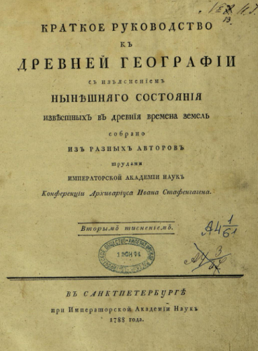 Стафенгаген, Иван Иванович (1728-1784). Краткое руководство к древней географии : с изъяснением нынешнего состояния известных в древние времена земель / собрано из разных авторов трудами Имп. Акад. наук Конференции архивариуса Ивана Стафенгагена. - 2-м тиснением. - Санкт-Петербург : При Имп. Акад. наук, 1788